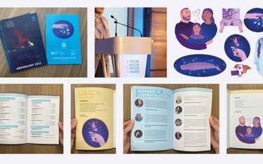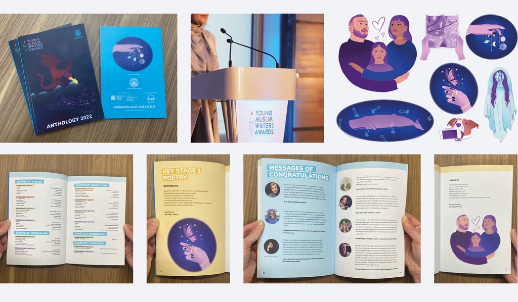 I have designed the Poetry Anthology for The Young Muslim Writers Awards from 2021-2023. Each anthology features around 20 hand-drawn illustrations to accompany the poems shortlisted for awards. The illustrations are drawn in ProCreate and the Anthology itself is compiled using InDesign. I always enjoy working on this project, as it is fun and wholesome to bring a child's imagination to life!